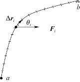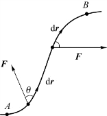 当物体受一变力在空间中持续一个过程,如持续一段曲线,如图4.3所示,且F随空间变化,这时需要将物体经过的路径无限分割成很多微小的曲线段,每个微小曲线段上的位移为Δr i,微小曲线段的长度近似为微小位移Δr i的大小,即Δr i 。每个微小曲线段上的变力近似地用恒力F i代替。这里采用以直线段代替曲线段、以恒力代替变力的方法。则任一曲线段上变力做的功就可以近似地表示为