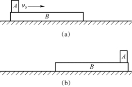 例4.2 质量为m B的木板静止在光滑桌面上,质量为m A的物体放在木板B的一端,现给物体A一初始速度v 0使其在B板上滑动,如图4.9(a)所示,设A、B之间的摩擦因数为μ,m A=m B,并设A滑到B的另一端时A、B恰好具有相同的速度,求B板的长度以及B板走过的距离。(A可视为质点。)