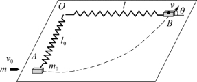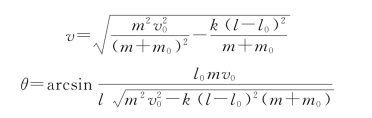 例4.6 如图4.15所示,在光滑的水平桌面上A点处放有质量为m 0的木块,木块与弹簧相连,弹簧的另一端固定在O点,其劲度系数为k。开始时弹簧处于自由长度l 0。设有一质量为m的子弹以速度v 0沿垂直于OA方向射入木块,并嵌在其中。当木块运动到B点时,弹簧长度为l,试求木块在B点时的速度v的大小和方向。