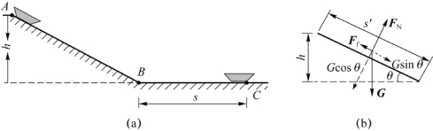 例4.4 如图4.13所示,雪橇从高50 m的山顶A点沿冰道由静止下滑,坡道AB长500 m,滑至B点后,又沿水平冰道继续滑行若干米后停止在C点处。若μ=0.050,求雪橇沿水平冰道滑行的路程。