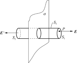 解 由题意知,平面产生的电场是关于平面两侧对称的,场强方向垂直于平面,与平面距离相等的任意两点处的E值相等。设P为考察点,过点P作一底面平行于平面、关于平面对称的圆柱形高斯面,右端面为S 1,左端面为S 2,侧面为S 3,由高斯定理知