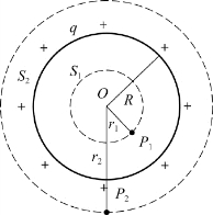 以O为球心,过P 2点作半径为r 2的球形高斯面S 2,由高斯定理知