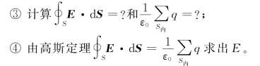 前面我们应用高斯定理求出了几种带电体产生的场强,从这几个例子可以看出,用高斯定理求场强是比较简单的。但是,我们应该明确,虽然高斯定理是普遍成立的,但并不是任何带电体产生的场强都能由它计算出,因为这样的计算是有条件的,它要求电场分布具有一定的对称性,在具有某种对称性时,才能适选高斯面,从而很方便地计算。应用高斯定理时,一般步骤如下: