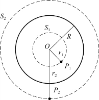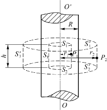 以OO′为轴,过点P 1作以r 1为半径、高为h的圆柱高斯面,上底为S 1,下底为S 2,侧面为S 3。由高斯定理知