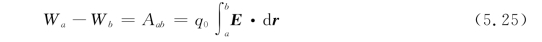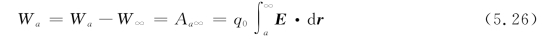 式(5.25)只说明了a、b两点的电势能的变化量,而不能确定q 0在电场中某点的电势能,因为电势能和重力势能一样,是一个相对量,只有选定了零势能点(参考点)的位置,才能确定q 0在电场中某一点的电势能。电势能零点的选择是任意的。当电荷分布在有限空间时,通常选择q 0在无限远处的电势能为零,亦即令式(5.25)中的b为无穷远,W∞=0,则