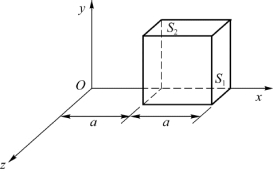 4.如习题图5.12所示,真空中,沿Ox轴正方向分布着电场,电场强度为E=bx(b为正的常量)。作一边长a的正方形高斯面,则通过高斯面右侧面S 1的电通量Φ1=_________,通过上表面S 2的电通量Φ2=_________,立方体内的净电荷为Q=________。