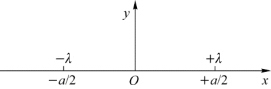 6.如习题图5.13所示,有两根与纸面垂直的无限长均匀带电直线,其电荷密度分别为+λ和-λ,分别位于x=+a/2及x=-a/2处,Oy轴上任意一点的电场强度大小为________,方向为_________。