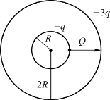 14.如习题图5.9所示,在真空中半径为R和2R的两个同心球面上分别均匀地带有电量+q和-3q。现将一电量为+Q的带电粒子从内球面处由静止释放,则该粒子到达外球面时的动能为( )。