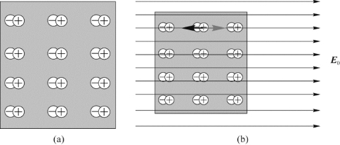 从微观角度来看,如图6.1所示,金属导体是由带正电的晶格和带负电的自由电子构成的,晶格不动,相当于骨架,而自由电子可自由运动,充满整个导体。从宏观上看,当没有外电场时,导体中的正负电荷等量均匀分布,无论是整个导体还是其中一部分,都呈电中性。自由电子只做微观的热运动,没有宏观的定向运动。