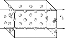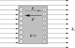感应电荷在金属板的内部建立起一个附加电场,其电场强度E′和外在的电场强度E 0的方向相反,这样金属板内部的电场强度E就是E 0和E′的叠加。开始时E′<E 0,金属板内部的电场强度不为零,自由电子会不断地向左移动,从而使E′增大。这个过程一直延续到金属板内部的电场强度等于零,即E=E 0+E′=0时为止。这时,导体上没有电荷做定向运动,导体处于静电平衡状态(图6.3)。