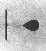 导体表面的电荷分布与导体的形状及周围的环境有关。根据实验,一个形状不规则的导体带电后,在表面上曲率越大的地方场强越强。由上面讨论的结果可知,E大的地方,σ必大,所以曲率大的地方(即越尖的地方)电荷面密度越大。如图6.8所示,实验表明,把一定量的电荷放到非球形导体上,当达到静电平衡时,导体为一等势体,导体表面为一等势面。在A点附近,曲率半径较小,其电荷面密度和电场强度的值较大;而在B点附近,曲率半径较大,其电荷面密度和电场强度的值较小。图6.9给出了带有等量异号电荷的一个非球形导体和一块平板导体的电场线图像。从图6.9中可以看出,曲率半径较小的带电导体表面附近,电场线密集,电场较强,尖端附近的电场最强。