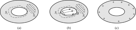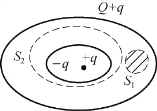 如图6.5(a)所示,在导体内部作一高斯面S 2,使S 2包围导体空腔。根据高斯定理,S 2内所包围电荷代数和为零。因为空腔内无其他电荷,静电平衡时,导体内又无净电荷,所以空腔内表面上的净电荷为0。