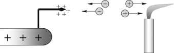 带电尖端附近的电场强度特别大,可使尖端附近的空气发生电离而成为导体。在电场不过分强的情况下,带电尖端经由电离化的空气而放电的过程,是比较平稳、悄无声息地进行的;但在电场很强的情况下,放电就会以暴烈的火花放电的形式出现,并在短暂的时间内释放出大量的能量。这两种形式的放电现象就是所谓的尖端放电现象。例如,阴雨潮湿天气时常可在高压输电线表面附近看到淡蓝色辉光的电晕,就是一种平稳的尖端放电现象。