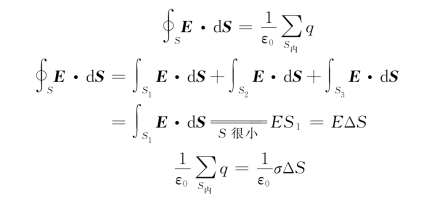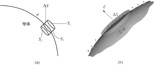 设在导体表面的某一面积元ΔS(很小)上,电荷分布如图6.7(a)所示,过ΔS边界作一小而扁的闭合圆柱S(硬币形高斯面),上下底S 1、S 2均与ΔS平行,侧面S 3与ΔS垂直,柱面的高很小,即S 1与S 2非常靠近ΔS,此圆柱是关于ΔS对称的。S作为高斯面,根据高斯定理有所以有