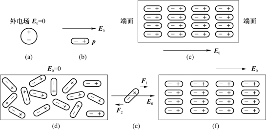 有极分子本身就相当于一个电偶极子,在没有外电场时,由于分子做不规则热运动,这些分子偶极子的排列是杂乱无章的,如图6.16(d)所示,所以电介质内部呈电中性。当有外电场时,每一个分子都受到一个电力矩作用,如图6.16(e)所示,这个力矩要使分子偶极子转到外电场方向,只是由于分子的热运动,各分子偶极子不能完全转到外电场的方向,只是部分地转到外电场的方向,即所有分子偶极子不是很整齐地沿着外电场E 0方向排列起来,如图6.16(f)所示。但随着外电场E 0的增强,排列的整齐程度增大。无论排列的整齐程度如何,在垂直外电场的两个端面上都产生了束缚电荷。