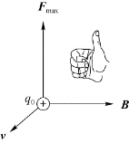 描述磁场特性的基本物理量是磁感应强度B。我们把磁场中某点静止的小磁针N极的指向方向规定为该点的磁感应强度B的方向。如图7.1所示,运动电荷在磁场中要受到磁力作用,实验证明,磁力大小与磁场和电荷运动速度有关,满足F=q 0v×B,这一公式被称为洛仑兹力公式。因此,B的大小规定为