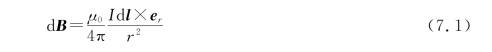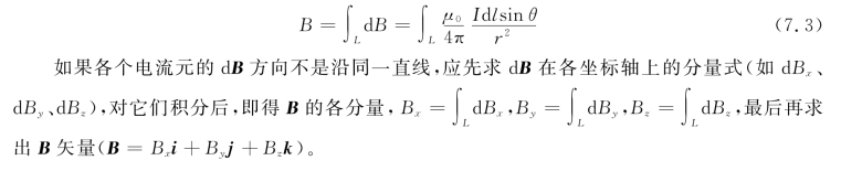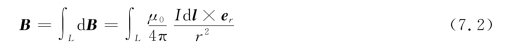 值得注意的是,式(7.2)中每一电流元在给定点产生的d B方向一般不相同,所以式(7.2)是矢量积分式。由于一般定积分的含义是代数和,所以求式(7.2)的积分时,应先分析各电流元在给定点所产生的d B的方向是否沿同一直线,如果是沿同一直线,则式(7.2)的矢量积分转化为