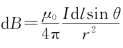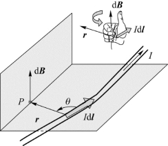 电流元I d l在空间任意一点P产生的磁感应强度d B遵守毕奥-萨伐尔定律:d B的大小与电流元I d l的大小成正比,与电流元和由电流元到点P的矢量r之间夹角的正弦成正比,与电流元到点P的距离的平方成反比;d B的方向垂直于I d l和r所组成的平面,其指向满足右手定则。用数学式子可以表示为其中,μ0称为真空磁导率,μ0=4π×10-7 N/A 2;e r是r方向的单位矢量。