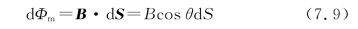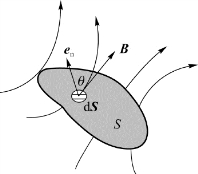 通过磁场中任一曲面的磁感应线(B线)条数,称为通过该曲面的磁通量,又称B通量,用Φm表示。磁通量是标量,但它有正、负之分。磁通量Φm的计算方法与电通量Φe的计算方法类似。如图7.9所示,在磁场中任一给定曲面S上取面积元d S,若d S的法线e n的方向与该处磁感应强度B的夹角为θ,则通过面积元d S的磁通量为