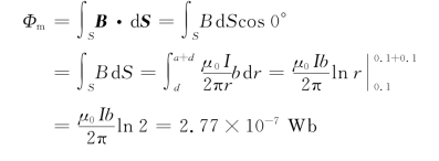 例7.4 真空中有一无限长直导线CD,通以电流I=10.0 A,一矩形EFGH与CD共面,如图7.10所示,其中a=d=10.0 cm,b=20.0 cm。求通过矩形EFGH面积S的磁通量。