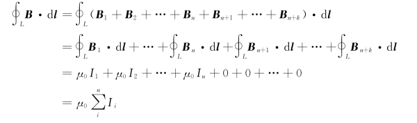 设电流I 1,I 2,…,In穿过回路,电流In+1,In+2,…,In+k不穿过回路。令B 1,B 2,…,B n+k分别为单根导线产生的磁场,则有