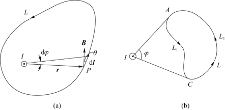 如图7.12(b)所示,如果闭合路径L不包围电流,则从L上某点出发,绕行一周后,φ的变化为零,即=0,因而有