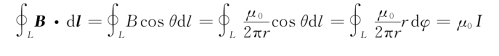设真空中有一长直载流导线,它所形成的磁场的磁感应线是一组以导线为轴线的同轴圆(图7.11),即圆心在导线上,圆形磁感应线所在的平面与导线垂直。在垂直于长直载流导线的平面内,任取一条以载流导线为圆心、半径为r的圆形环路L作为积分的闭合路径,则在这圆周路径上的磁感应强度的大小为B=,其方向与圆周相切。如果积分路径的绕行方向与该条磁感应线方向相同,也就是积分路径的绕行方向与包围的电流成右手螺旋关系,则B与d l间的夹角处处为零,于是