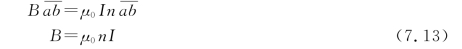 如图7.16所示,设螺线管是均匀密绕的,缠绕密度(即单位长度上的线圈匝数)为n,通有电流I。