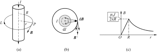 解 如图7.15(b)所示,利用磁场叠加原理和对称性分析,由于电流分布对圆柱轴线具有对称性,因此磁场分布对轴线也具有对称性,磁感应线应该是在垂直轴线平面内以轴线为中心的同心圆,方向绕电流的方向右旋(如图7.6(b)所示),而且在同一圆周上磁感应强度B的大小相等。