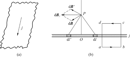 设电流均匀地流过一无限大平面导体薄板,电流面密度为j(即通过与电流方向垂直的单位长度的电流),如图7.18(a)所示。