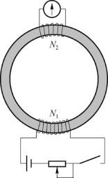 解 当合上开关使N 1中的电流增大时,它在铁环中产生的磁场也增强,因而N 2线圈中有感生电动势产生。以S表示环的截面积,以B表示环内磁感应强度,则Φ=BS,而N 2中的感生电动势的大小为
