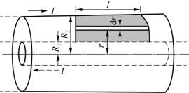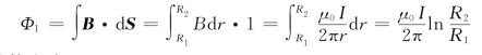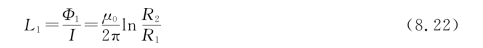 例8.6 一根电缆由同轴的两个薄壁金属管构成,半径分别为R 1和R 2,两管壁间充以μr=1的电介质。电流由内管流走,由外管流回。试求单位长度的这种电缆的自感系数。