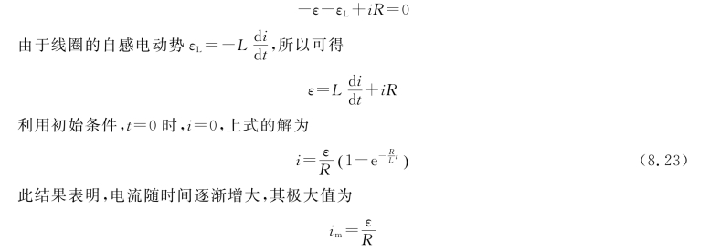 式(8.23)的指数L/R具有时间的量纲,称为此电路的时间常数。常以τ表示时间常数,即τ=L/R。开关接通后经过时间τ,电流与其最大值的差为最大值的1/e。当t大于τ的若干倍之后,电流基本上达到最大值,就可以认为是稳定的了。图8.14(b)给出了上述电路中电流随时间增长的情况。