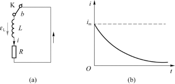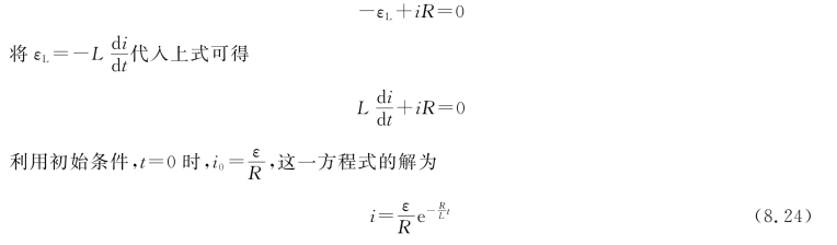 这一结果说明,电流随时间按指数规律减小。当t=τ时,i减小为原来的1/e。式(8.24)所示的电流与时间的关系曲线如图8.15(b)所示。