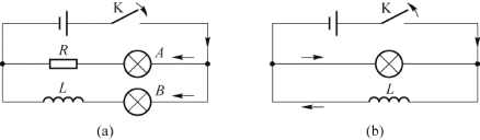 式(8.23)和式(8.24)所表示的电流变化情况还可以用实验演示。在图8.16(a)所示的实验中,当合上开关后,A灯比B灯先亮,就是因为在合上开关后,A、B两支路同时接通,但B灯的支路中有一多匝线圈,自感系数较大,因而电流增长较慢。而在图8.16(b)所示的实验中,在打开开关时,灯泡突然强烈地闪亮一下再熄灭,就是因为多匝线圈支路中较大的电流在开关打开后通过灯泡而又逐渐消失的缘故。