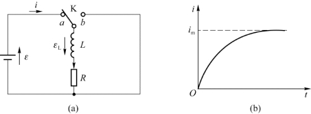例8.7 RL电路。如图8.14(a)所示,由一自感线圈L、电阻R与电源ε组成的电路。当开关K与端a相接触时,自感线圈和电阻串联而与电源相接,求接通后电流的变化情况。待电流稳定后,再迅速将开关打向b端,求此后的电流变化情况。