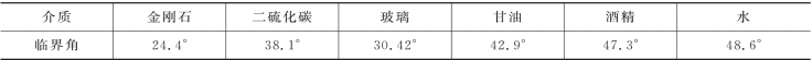 可见,光疏介质的折射率n 2越小,光密介质的折射率n 1越大,发生全反射的临界角越小,即越容易发生全反射。表9.2是几种常见物质对真空(空气)的临界角。