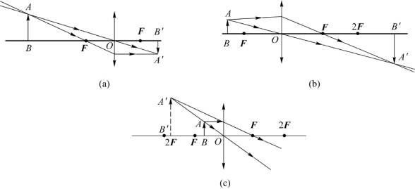 凸透镜所成的像可以用作图法求出,其具体方法如下:用通过光心且与主光轴垂直的直线来表示薄透镜,要求出某一发光点的像的位置,只需作出以下三条特殊光线中的两条就可以确定像点的位置,如图9.10所示。
