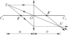 如图9.9所示,通过透镜两球面球心C 1、C 2的直线称为透镜的主光轴。主光轴与透镜两球面的交点对薄透镜而言可以看作一点,称为透镜的光心O。平行于主光轴的光线,经过凸透镜后会聚于主光轴上的一点,这个点称为透镜的实焦点,平行于主轴的光线经过凹透镜后被发散,这些发散的光线反向延长时也会聚于一点,这个点称为凹透镜的虚焦点。透镜的焦点与光心的距离称为焦距f,像与光心的水平距离称为像距v,物体与光心的水平距离称为物距u。