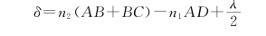 由此可见,光波在介质中的路程x相当于在真空中的路程nx。我们将光波在某介质中所经历的几何路程x与这种介质的折射率n的乘积nx定义为光程。计算光程实际上就是计算与介质中几何路程相当的真空中的路程,也就是把涉及不同介质时的复杂情形都变换成真空中的情形。由此可见,两束相干光通过不同介质后,在空间某点相遇时所产生的干涉现象与两者的光程差(用符号δ表示)有关,而不决定于两者的几何路程差。两束初位相相同的相干光在相遇点的位相差Δφ与光程差δ间存在下述关系: