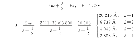 因为可见光为4 000~7 600Å,所以反射光中λ2=6 739Å和λ3=4 043Å的光得到了加强,前者为红光,后者为紫光。即膜正面呈红、紫色。