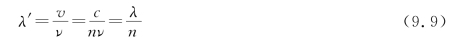 对于给定的单色光,其频率ν在不同介质中是恒定不变的。在折射率为n的介质中,光速v是真空中光速c的1/n,即v=c/n,则在这种介质中传播的单色光波长为
