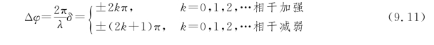 式(9.15)与式(9.13)相比,差λ/2。可见当反射光相互加强时,透射光将相互减弱,二者形成“互补”的干涉图样。若用复色光源,则能观察到彩色的干涉条纹。