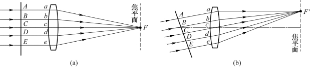 这是由于在平行光束波阵面上各点(如图9.15(a)中A、B、C、D、E点)的位相相同,到达焦平面后位相仍然相同,因而相互加强。可见,从A、B、C、D、E等各点到F点的光程相等。关于这个事实还可这样理解,虽然光线Aa F比光线Cc F经过的几何路程长,但是透镜的折射率大于1,因此折算成光程后,Aa F的光程与Cc F的光程相等。对于斜入射的平行光,会聚于焦平面上的F′点,类似讨论可知Aa F′、BbF′等的光程均相等,如图9.15(b)所示。因此,在观察干涉时,使用透镜不引起附加的光程差。