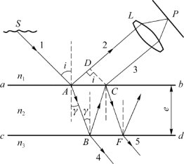 如图9.16所示,折射率为n 2的平行平面薄膜,其上、下层介质的折射率分别为n 1和n 3,设n 1<n 2>n 3,ab、cd分别为薄膜的上、下两个表面。由扩展光源上S点发出的光线1,以入射角i投射到薄膜上表面的A点后,分为两部分,一部分由A点反射,成为光线2;另一部分射入薄膜,产生折射,又在下表面B点被大部分反射,再经界面ab而出成为光线3。显然,光线2和光线3是两条平行光线,经透镜L会聚于P点。由于光线2、3是由同一入射光线分出的两部分,只是经历了不同的路径而有恒定的光程差,亦即具有恒定的位相差,因此它们是相干光,在会聚的P点会产生干涉现象。