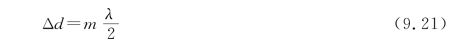 如果M 1和M 2严格地相互垂直,则M′2与M 1也就严格平行,这样便在M′2与M 1之间形成一平行平面空气薄膜。结果P点处观察者的视场中将看到环形的干涉条纹。如果M 2做微小平移,则环形条纹将由中心“冒出”或向中心收扰并“淹没”。每有一级环形条纹冒出或淹没表示M 2平移了λ/2的距离,因而当能数出环形条纹变化的数目m时,也可知M 2所平移的距离,如式(9.21)所示。由式(9.21)可知,应用迈克尔逊干涉仪,可以由已知波长的光束来测定微小长度,也可由已知的微小长度来测定某光波的未知波长。