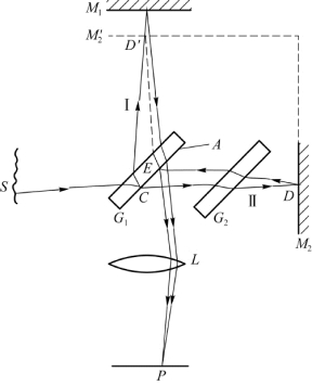 由扩展光源上一点S所发出的光线射向G 1时,被G 1的薄银层分为反射光Ⅰ和透射光Ⅱ,因而G 1又称为分光板。光线Ⅰ向M 1传播,经M 1反射后再穿过G 1,射到P点处的观察者眼睛或照相物镜上。光线Ⅱ穿过G 2后,向M 2传播,经M 2反射后,再穿过G 2,并经薄银层反射,也射到P点处。显然,光线Ⅰ和光线Ⅱ是两束相干光线,因而P点处观察者的眼睛或照相物镜能看到或获得干涉图样。装置中放置G 2的目的是使光线Ⅰ和光线Ⅱ都穿过同样厚度的玻璃片三次,以补偿光线Ⅱ只通过G 1一次而引起的与光线的较大附加光程差,因此常把G 2称为补偿板。