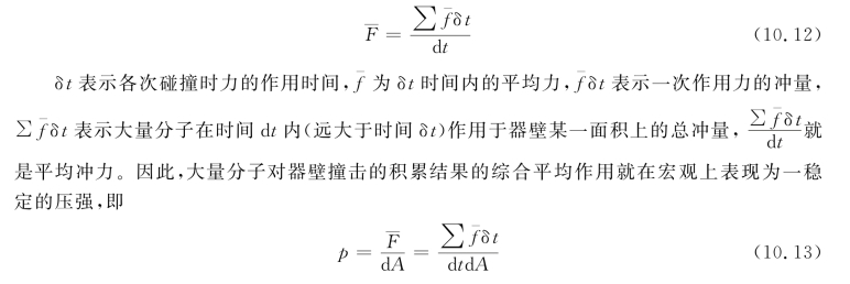 宏观上所测量到的气体施与容器壁上的压强,是大量气体分子对容器壁不断碰撞的结果。因为就单个分子来说,它在什么时候,以多大冲击力,碰在器壁什么地方都是偶然的。但由于分子的数量巨大,而它们对器壁的碰撞又是极其频繁的,因此在我们观测的时间d t内(例如d t=1 s,这对微观粒子的运动来说,时间已足够长了),仪器感受不到个别分子冲力的瞬时变化,只记录到大量分子的综合平均冲力