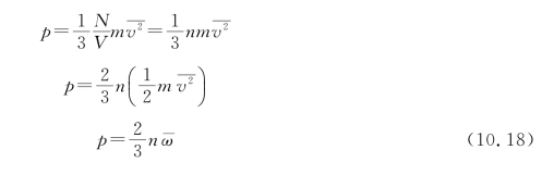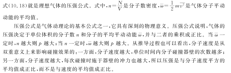 因为平均说来,全体分子约有一半向左运动(vix<0),另一半向右运动(v ix>0),而向左运动的一半是不必考虑的,因此累加号前乘1/2。将式(10.17)代入式(10.13),则气体的压强为