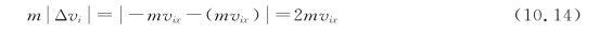 为简单起见,设分子与器壁的碰撞是完全弹性的,因此碰撞前后分子速度沿器壁切线方向分量没有改变,法线分量由v x变为-v x。根据动量定理,速度为v i的分子撞击器壁后,由于器壁给予分子的反冲量而引起分子的动量改变量为